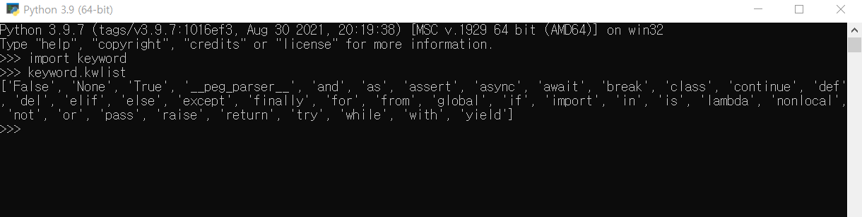 - 파이썬의 키워드는 버전 별로 추가 또는 삭제될 수 있으므로 현재 버전의 키워드 목록을 확인함