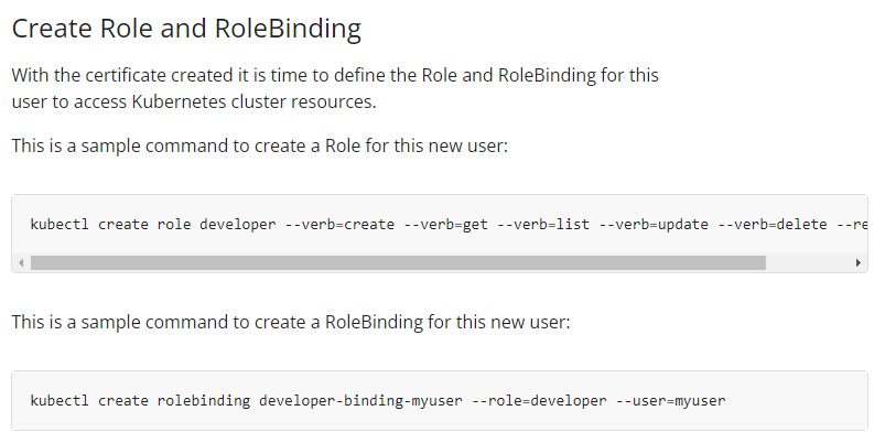 아래 명령어를 활용하여 role 및 rolebinding 생성