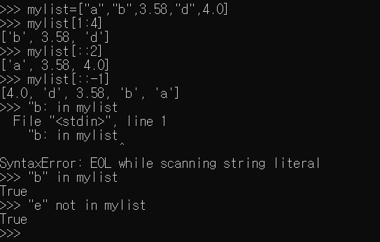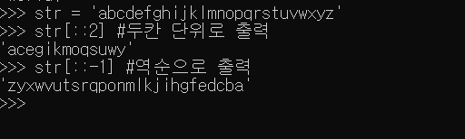 - 대괄호[] 안에 [인덱스시작:익덱스끝:스텝] 순서로 저장