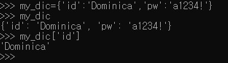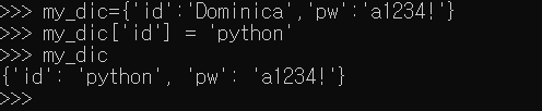 - 딕셔너리에 새로운 key 값을 입력할 때 반드시 key 값에 해당하는 value도 함께 입력