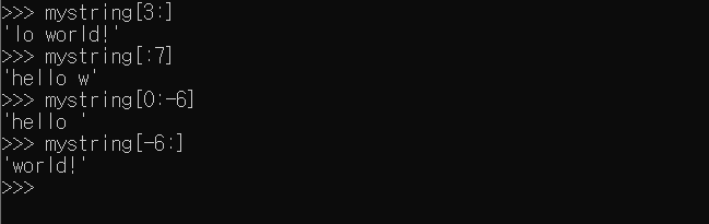 - 콜론을 이용하여 인덱스의 범위를 지정해서 사용