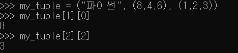 - Tuple은 고정된 리스트, 자료 수정이 불가 하지만 list는 자료의 수정이 자유로움