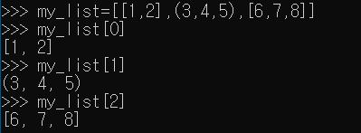 - 대괄호[] 안에 혼합형 자료형의 콤아(,)로 구분해서 값을 대입하여 사용