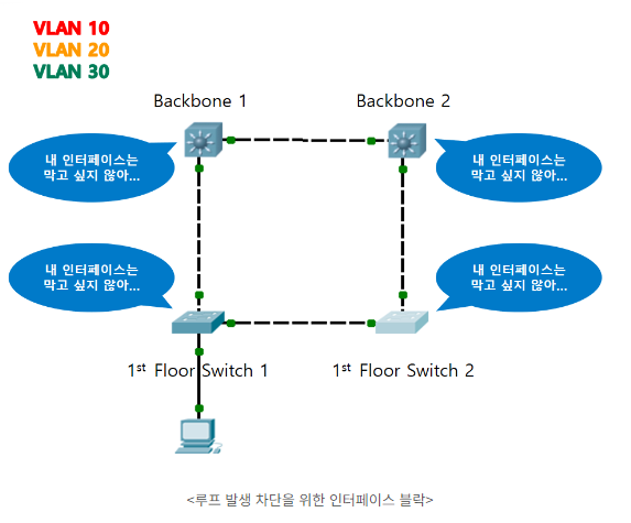 루트 스위치와의 친분이 가장 적은 스위치는 인터페이스를 블락해야 합니다.