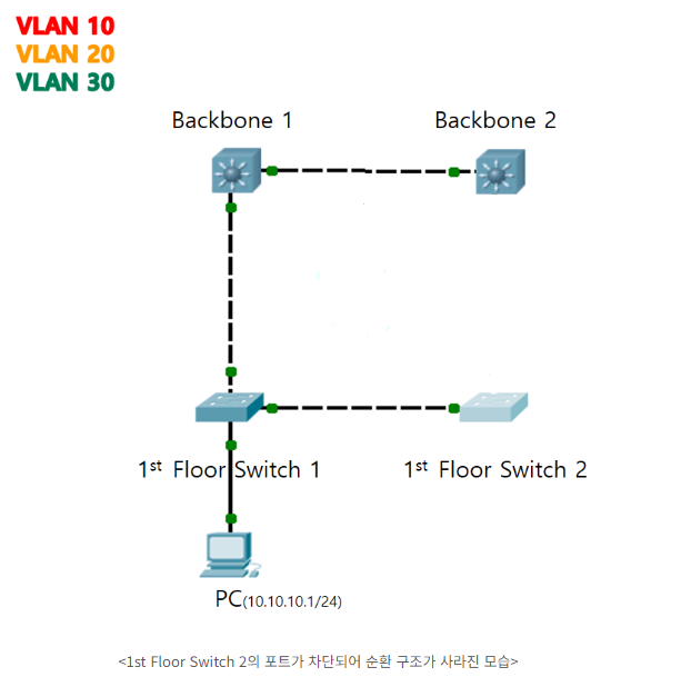이 일련의 과정을 거치면 순환 구조가 사라지고 더 이상 이더넷 프레임이 빙빙 돌지 않게 됩니다. 스패닝 트리 프로토콜의 궁극적인 목적을 달성하는것 입니다.