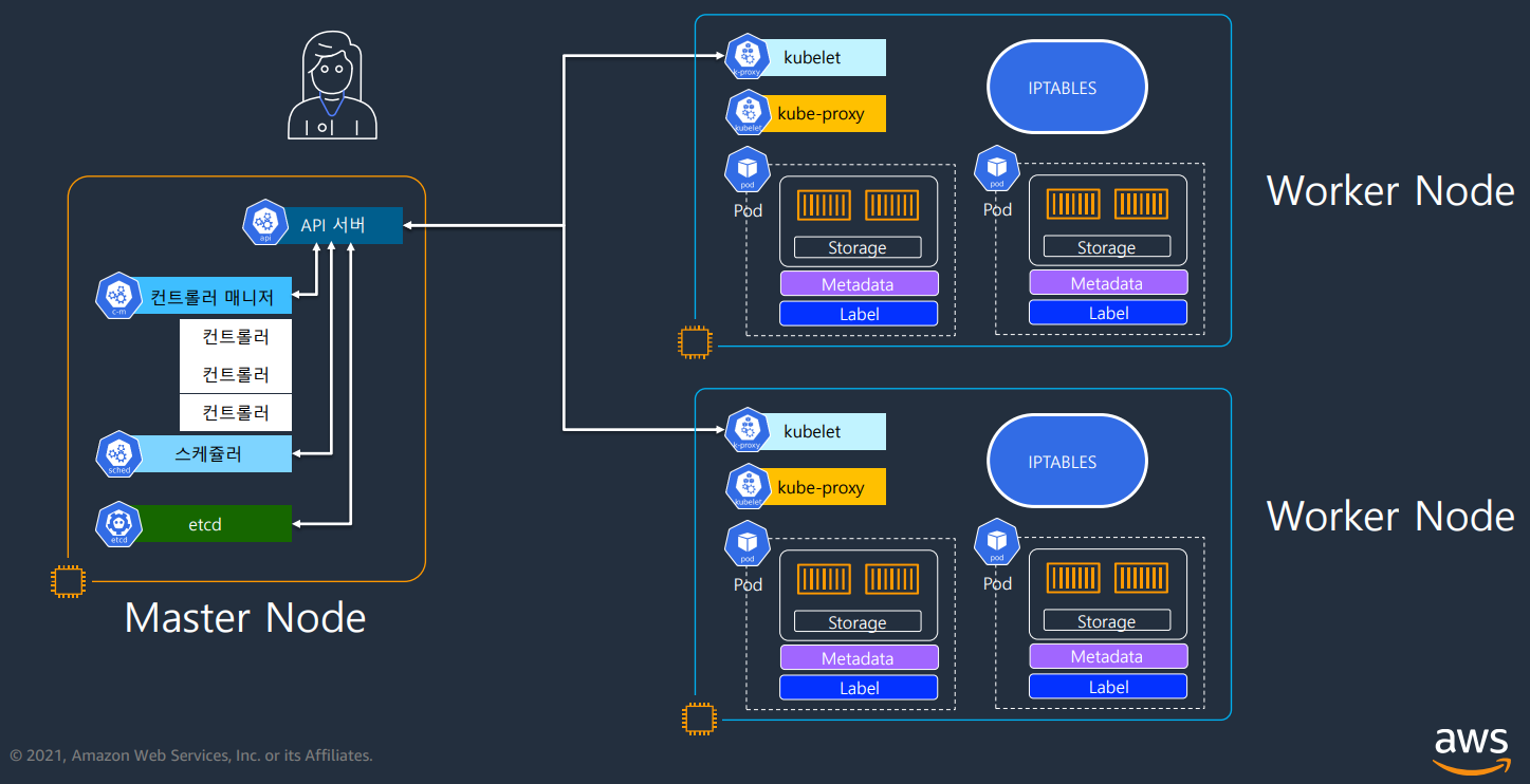 - Pod를 복제하거나 노드 운영 등 각 리소스를 제어하는 컨트롤러들을 감독하고 실행