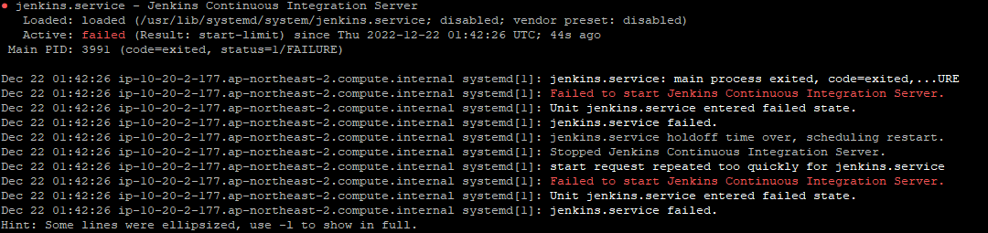 Dec 22 01:46:25 ip-10-20-2-177.ap-northeast-2.compute.internal systemd[1]: Failed to start Jenkins Continuous Integration Server.