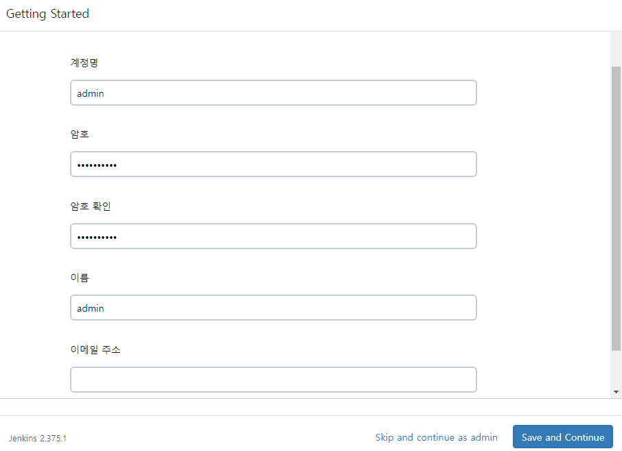 기본 플러그인들이 설치되면 초기 계정 생성 화면이 나옴 (관리자 계정 추가)
