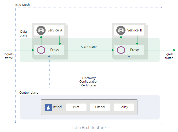 위의 구조에서 보면 크게는 Data plane과 Control Plane으로 볼 수 있다. 그 아래에 이 전에는 구분되어 있던 Pilot, Citadel, Galley 영역이 istiod로 통합되어 있는 것을 확인 할 수 있는데 각 기능은 아래와 같다.