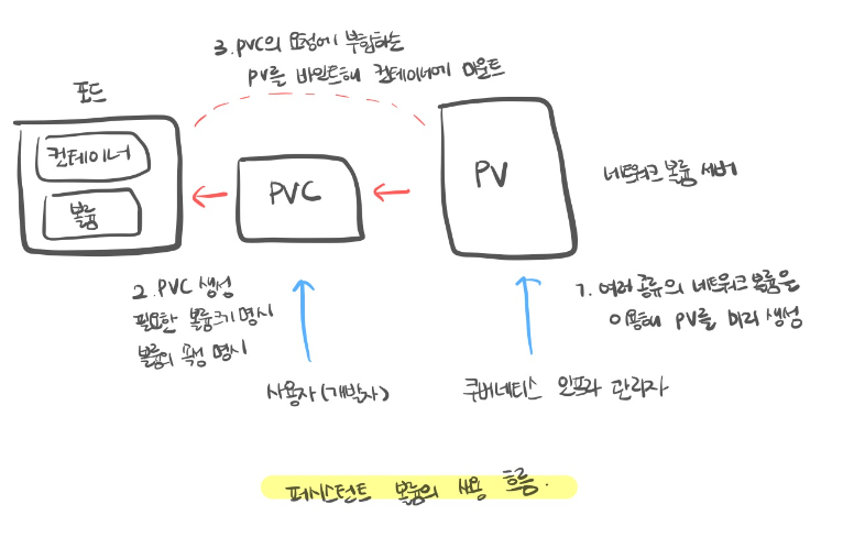 " PV는 관리자에 의해 생성된 볼륨을 뜻하고, PVC는 사용자가 볼륨을 사용하기 위해 PV에 요청을 하게 된다."